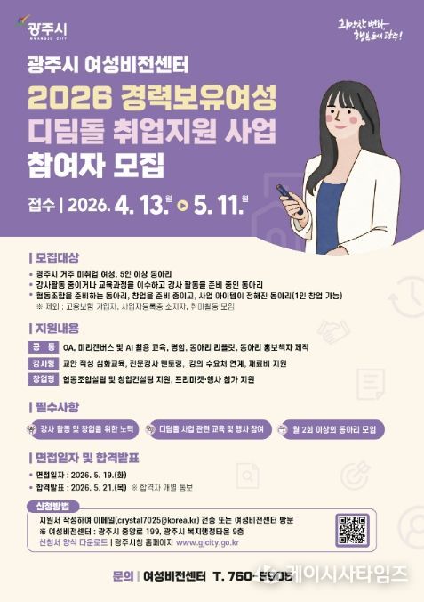 (케이시사타임즈) 광주시는 지역 내 경력보유여성의 사회 재진출과 취업 역량 강화를 위해 ‘2026 경력보유여성 디딤돌 취업 지원 사업’ 참여자를 오는 5월 11일까지 모집한다고 22일 밝혔다.