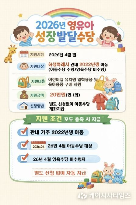 (케이시사타임즈) 화성특례시는 어린이집 및 유치원 입학 초기 영유아 가정의 양육 부담을 덜고 아동의 건강한 성장을 지원하기 위해 ‘2026년 영유아 성장발달수당’을 지급한다고 밝혔다.
