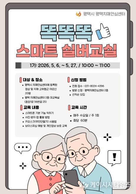 (케이시사타임즈) 평택치매안심센터는 오는 5월 6일부터 27일까지 치매 예방 및 인지 기능 강화를 위한 ‘똑똑똑 스마트 실버교실’을 운영한다고 밝혔다.