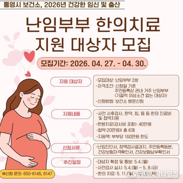 선정된 부부는 관내 지정 한의 의료기관인‘대건한의원’과‘통영잘보는한의원’에서 진료를 받을 수 있다.