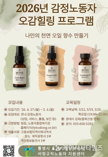 (케이시사타임즈) 통영시는 관내 서비스업, 돌봄, 보건, 상담 등 다양한 직군의 감정노동자들의 마음 치유와 휴식에 초점을 맞춰 ‘2026년 감정노동자 오감힐링 프로그램’을 통영시노동자종합복지관에서 운영한다고 22일 밝혔다.