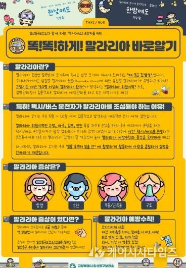 (케이시사타임즈) 고양특례시 일산동구보건소는 말라리아 매개모기가 본격적으로 활동하는 시기를 대비해 택시와 버스 등 운전 종사자들을 대상으로 “똑!똑!하!게! 말라리아 바로알기”를 오는 5월부터 홍보할 예정이라고 밝혔다.