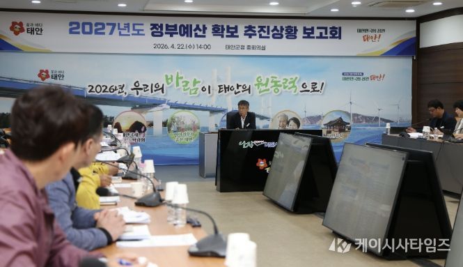 (케이시사타임즈) 태안군이 22일 군청 중회의실에서 이주영 부군수와 각 부서장 등 30여 명이 참석한 가운데 ‘2027년도 정부예산 확보 추진 상황 보고회’를 열고 부처 예산안 반영 현황을 점검하며 세부 대응 전략 논의에 나섰다.