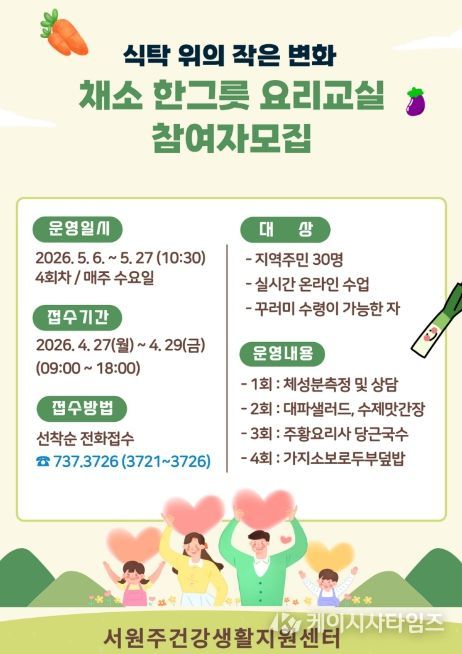 (케이시사타임즈) 서원주건강생활지원센터는 증가하는 만성질환에 대응하기 위한 ‘식탁 위의 작은 변화, 채소 한그릇 요리교실’ 프로그램 참여자를 모집한다.