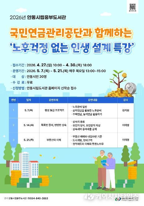(케이시사타임즈) 안동시립웅부도서관은 지역 주민들에게 건강하고 안정적인 노후생활을 지원하기 위해 부동산, 연금, 상속 등 행복한 노후 설계의 핵심 노하우를 전하는 ‘노후 걱정 없는 인생 설계’ 특강을 운영한다고 23일 밝혔다.