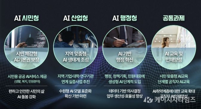 ‘시민 모두의 인공지능 기본권 실현’, ‘인공지능 산업생태계 조성’, ‘인공지능 기반 행정 혁신’을 3대 목표로 설정하고, ▲인공지능(AI) 시민청 ▲인공지능(AI) 산업청 ▲인공지능(AI) 행정청 ▲인공지능 교육·인재 양성으로 분야를 나눠 인공지능 기반 사업을 추진한다.