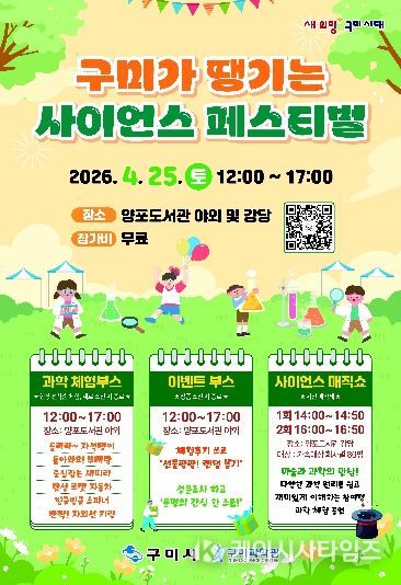 (케이시사타임즈) 구미과학관은 4월 과학의 달을 맞아 4월 25일 구미어린이과학체험관(양포도서관 내) 일원에서 '구미가 땡기는 사이언스 페스티벌'을 개최한다. 과학을 놀이처럼 즐길 수 있도록 구성한 참여형 행사로, 시민 누구나 부담 없이 참여할 수 있다.