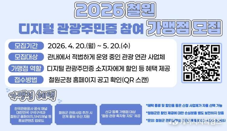 철원군 관광정책실은 지역 관광 산업의 경쟁력을 높이고 외지 방문객의 지속적인 유입을 도모하기 위해 ‘2026년 철원군 디지털 관광주민증’ 참여 가맹점을 신규 모집한다고 밝혔다.