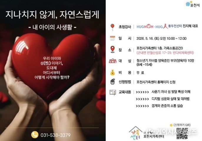 (케이시사타임즈) 포천시 직영 더 큰 행복 포천시가족센터는 오는 21일부터 사춘기 자녀를 둔 양육자를 대상으로 부모 교육 프로그램 ‘지나치지 않게, 자연스럽게’의 참여자를 모집한다. 이번 교육은 5월 16일 오전, 포천시가족센터 가족소통공간(반다비체육센터 1층)에서 대면 강의로 진행된다.