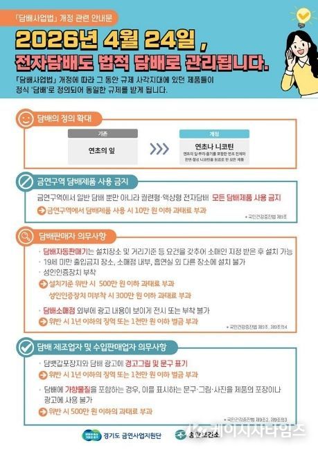 (케이시사타임즈) 평택시는 2026년 4월 24일부터 시행되는 개정 '담배사업법'에 따라 전자담배를 포함한 모든 니코틴 제품이 ‘담배’로 규정되며, 금연구역 내 전자담배 흡연 시 과태료 10만 원이 부과된다고 밝혔다.
