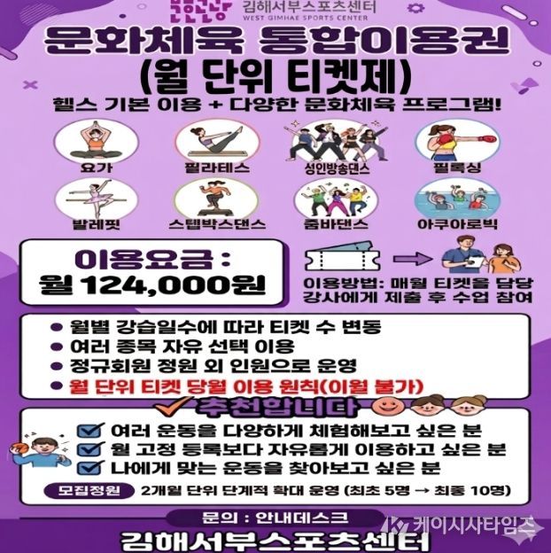 (케이시사타임즈) (재)김해문화관광재단 김해서부스포츠센터는 이용자 중심의 유연한 운동환경 조성과 문화체육 프로그램 활성화를 위해 김해시 공공체육시설 최초로 ‘문화체육 티켓제 통합이용권’ 도입을 추진한다고 밝혔다.