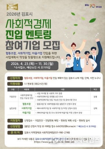 (케이시사타임즈) 김포시는 협동조합, 사회적기업, 마을기업 등 사회적경제기업 진입을 지원하기 위해 ‘2026년 김포시 사회적경제 진입 멘토링’ 참여기업을 오는 11월 30일까지 수시 모집한다.