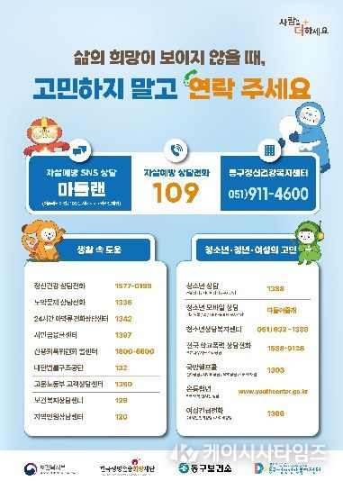 (케이시사타임즈) 동구보건소는 봄철 자살 고위험 시기(3월~5월)를 맞아 생명존중 문화 확산과 자살예방을 위한 집중 관리 및 홍보를 추진한다고 밝혔다.