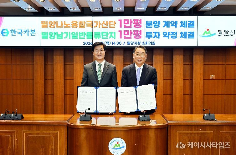 (케이시사타임즈) 경남 밀양시는 23일 시청 소회의실에서 ㈜한국카본, 한국토지주택공사 경남지역본부와 함께 ‘밀양나노융합국가산업단지 부지분양 계약 및 밀양남기일반물류단지 투자약정’을 체결했다.