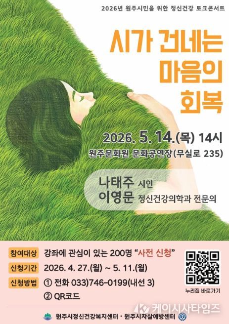 (케이시사타임즈) 원주시정신건강복지센터는 다음 달 14일 원주문화원 문화공연장에서 ‘시가 건네는 마음의 회복’을 주제로 정신건강 토크콘서트를 개최한다.