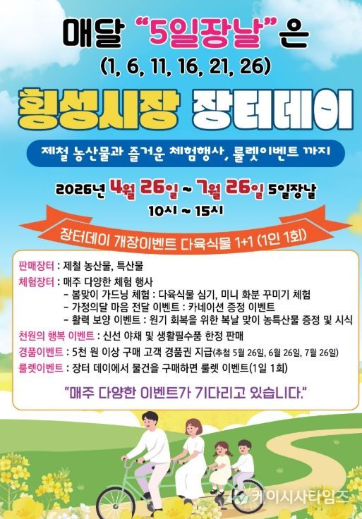 (케이시사타임즈) 횡성군이 전통시장 내 고객 유입을 촉진하고 지역 경제에 활력을 불어넣기 위해 오는 4월 26일부터 7월 26일까지 ‘2026 횡성전통시장 장터데이’ 행사를 개최한다.