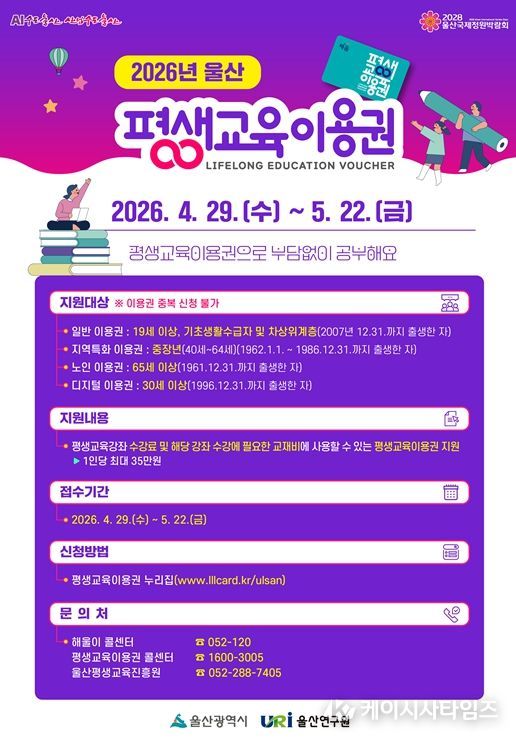 (케이시사타임즈) 울산시가 경제적 여건에 따른 교육격차를 완화하고, 성인의 자아실현을 지원하기 위해 ‘2026년 평생교육이용권 지원사업’의 2차 신청 접수에 나선다.