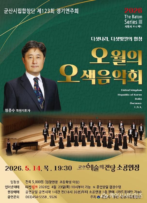 (케이시사타임즈) 군산시립합창단이 오는 5월 14일 오후 7시 30분, 군산예술의전당 소공연장에서 제123회 정기연주회 ‘오월의 오색음악회’를 개최한다.