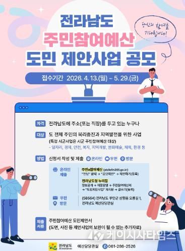 (케이시사타임즈) 전라남도는 2027년 예산 편성을 위한 주민참여예산 제안사업 공모를 5월 29일까지 진행한다고 밝혔다.
