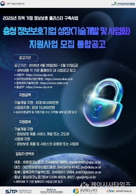 (케이시사타임즈) 세종테크노파크는 정보보호 유망기업 발굴 및 성장 지원을 위해 ‘정보보호 성장(기술개발 및 사업화) 지원사업’ 충청권 통합공고를 4월 28일부터 진행한다고 밝혔다.
