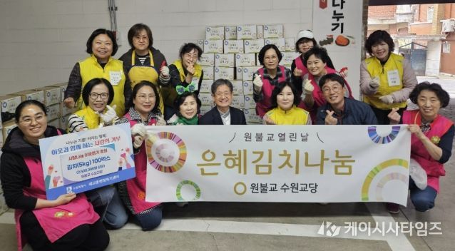 (케이시사타임즈) 수원시 팔달구 매교동은 지난 22일, 원불교 수원교당(교구장 김도천)으로부터 직접 담근 배추김치(5kg) 100박스를 기부받았다고 밝혔다.