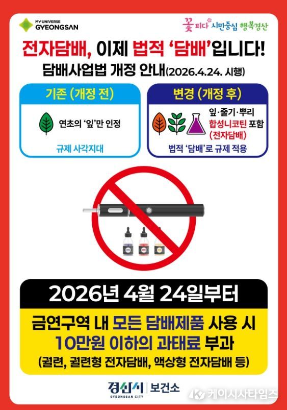 (케이시사타임즈) 경산시는 4월 24일부터 5월 15일까지 3주간 경산시보건소, 일자리경제과, (사)한국외식업중앙회 경산시지부와 함께 담배사업법 개정에 따른 법령 준수 정착을 위해 금연 구역 내 흡연 행위에 대한 집중 지도와 점검을 실시한다.