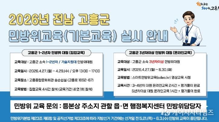 (케이시사타임즈) 고흥군은 민방위대원의 대응 역량을 강화하고자 2026년 상반기 민방위 기본교육을 실시한다고 밝혔다.