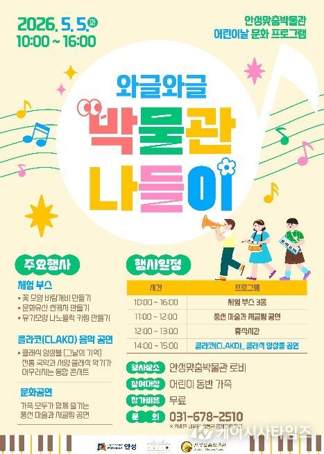 (케이시사타임즈) 안성맞춤박물관은 오는 5월 5일 어린이날을 맞아, 온 가족이 함께 즐길 수 있는 문화 프로그램 ‘와글와글 박물관 나들이’를 개최한다고 밝혔다.