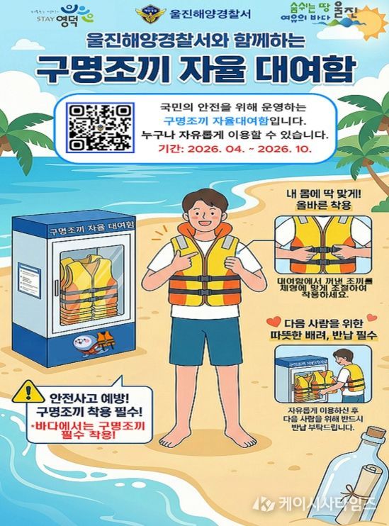(케이시사타임즈) 울진해양경찰서는 기존 해수욕장 개장 시기 구명조끼 자율대여함을 운영하던 것을 봄철 행락객 증가에 대비하여 조기 운영한다고 밝혔다.