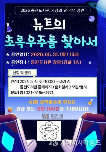 (케이시사타임즈) 김포시 통진도서관이 가정의 달을 맞아 온 가족이 함께 즐길 수 있는 공연 '뉴트의 초록우주를 찾아서'를 오는 5월 31일 오후 2시 통진도서관 강당에서 개최한다.
