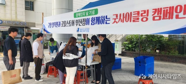 (케이시사타임즈) 부산 사하구는 제46회 장애인의 날(4월 20일)을 맞아 지난 4월 23일 사하구청 본청 및 제2청사에서 중증장애인 직업재활시설 ‘굿윌코리아 보호작업장’(시설장 김성태)과 함께 '굿사이클링' 기부 물품 나눔 행사를 개최했다.