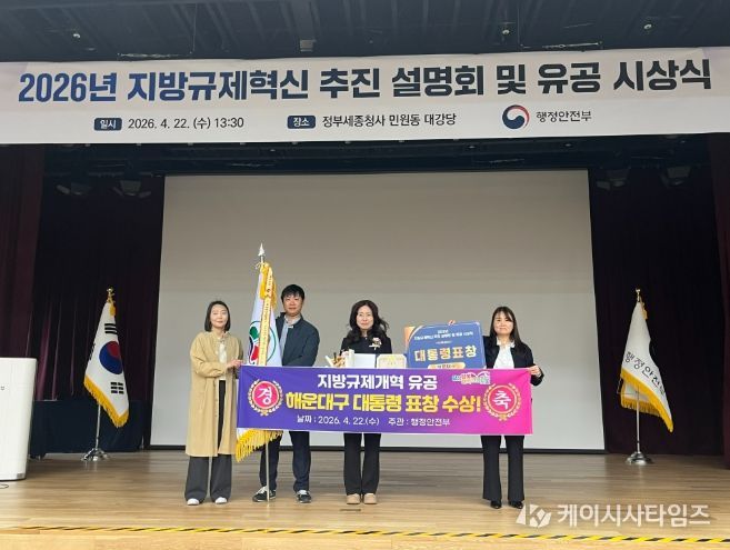 (케이시사타임즈) 해운대구는 행정안전부 주관‘2025년 지방규제혁신 추진 성과평가’에서 우수한 성과를 인정받아 지난 22일 지방규제개혁 유공 대통령 표창을 수상하였다.