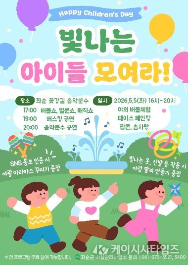 (케이시사타임즈) 화순군은 오는 5월 5일 오후 4시부터 밤 8시까지 꽃강길 음악분수대에서 어린이날 특별 행사 ‘빛나는 아이들 모여라’를 개최한다고 밝혔다.