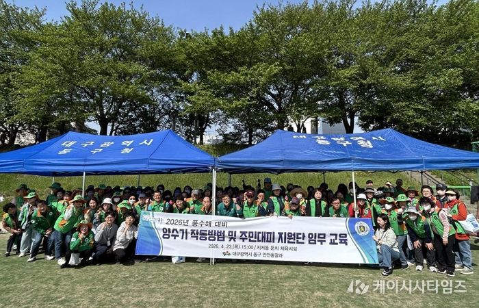 (케이시사타임즈) 대구 동구청은 지난 23일, 지저동 둔치 체육시설에서 동구 지역자율방재단 단원 및 관내 22개 동 행정복지센터 재난안전담당자 120여명이 참여한 가운데 양수기 작동법 및 주민대피지원단 임무 교육을 실시했다.