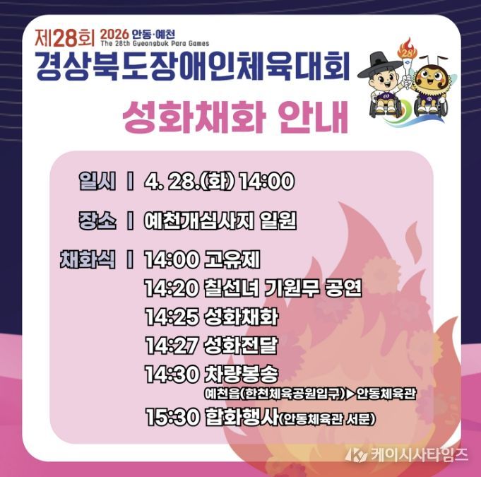 (케이시사타임즈) 예천군은 오는 28일, 예천과 안동이 공동으로 주관하는 ‘제28회 경상북도장애인체육대회’의 시작을 알리는 성화 채화식을 예천 개심사지에서 개최한다.
