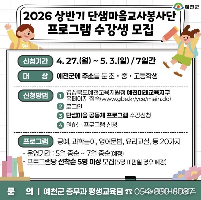 (케이시사타임즈) 예천군은 4월 27일부터 5월 3일까지 2026년 상반기 단샘마을교사봉사단 프로그램 수강생을 모집한다.