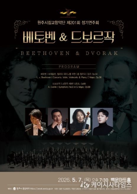 (케이시사타임즈) 원주시립교향악단 제201회 정기연주회가 오는 5월 7일 오후 7시 30분 백운아트홀에서 개최된다. 이번 연주회에는 지휘자 조규진과 바이올리니스트 김남훈, 첼리스트 홍승아, 피아니스트 신효건이 협연자로 나서 베토벤 3중 협주곡 C장조와 드보르작 교향곡 제8번 G장조를 선보일 예정이다.