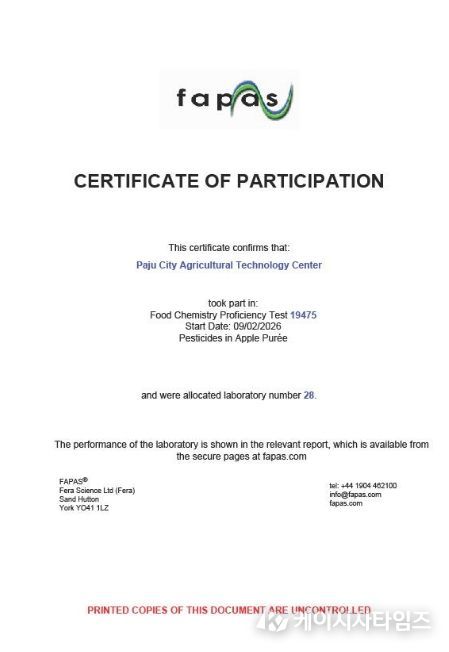 (케이시사타임즈) 파주시 농산물 안전분석실이 국제적으로 공신력 있는 잔류농약 분석 능력 평가에서 4년 연속 우수한 결과를 달성하며 세계 수준의 분석 역량을 입증했다.