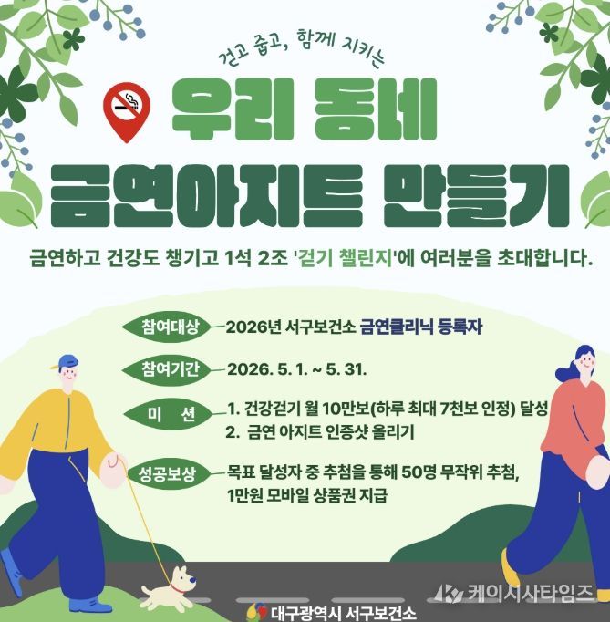 (케이시사타임즈) 대구 서구보건소는 금연 시도자들이 일상에서 즐겁게 목표를 달성할 수 있도록 금연 실천과 신체 활동을 결합한 ‘우리 동네 금연 아지트 만들기’ 챌린지를 오는 5월부터 10월까지 본격 운영한다고 밝혔다.