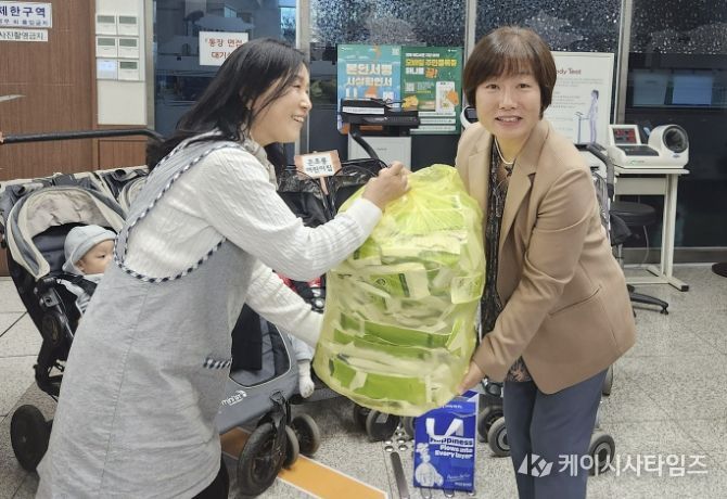이날 은초롱 어린이집 원아와 관계자들은 정자3동 행정복지센터를 방문해 우유팩과 폐건전지 등 유용생활폐자원을 분리 배출하며 자원순환의 의미를 되새겼다.