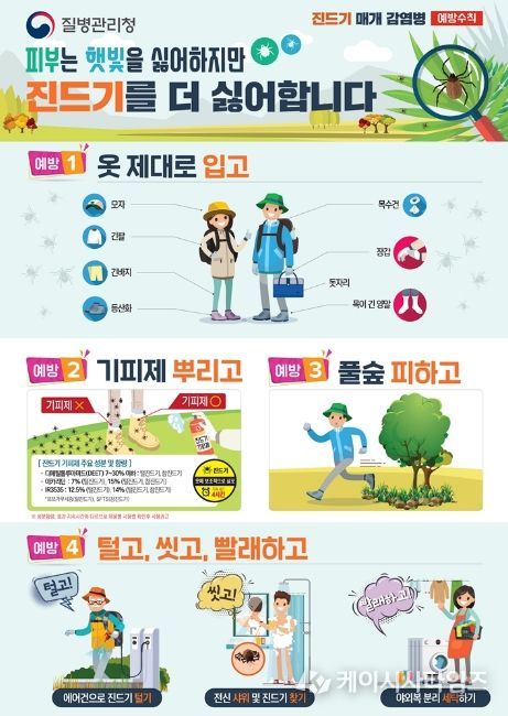 (케이시사타임즈) 의정부시 보건소는 따뜻한 날씨로 농작업, 등산, 캠핑 등 야외활동이 본격화됨에 따라 진드기 매개 감염병 예방수칙 준수를 시민들에게 당부했다.