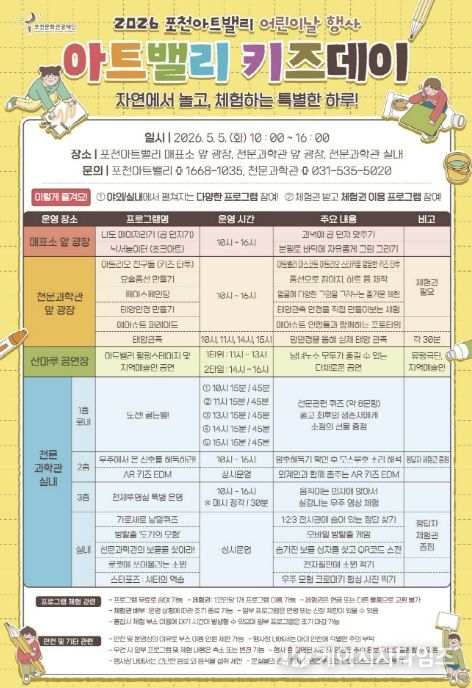 (케이시사타임즈) 포천문화관광재단이 운영하는 포천아트밸리는 오는 5월 5일 어린이날을 맞아 어린이와 가족을 위한 체험형 문화행사 ‘아트밸리 키즈데이’를 개최한다.