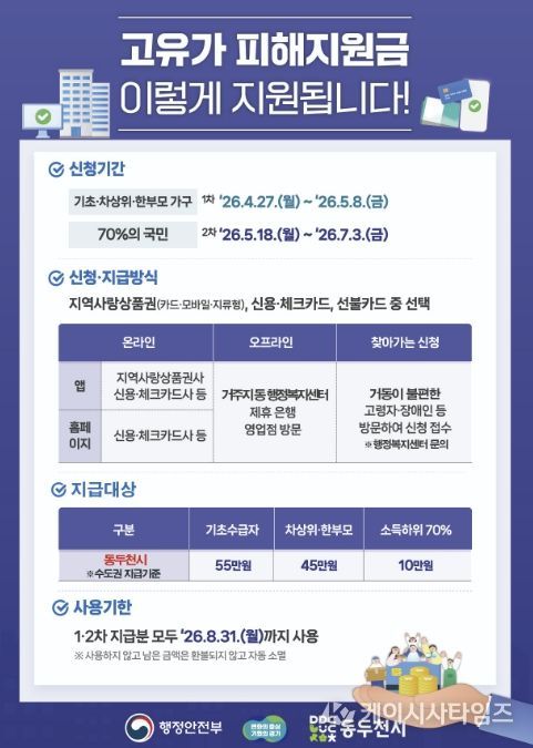 (케이시사타임즈) 동두천시가 중동발 고유가와 고물가로 인한 시민 부담을 완화하고 지역경제 회복을 지원하기 위해 ‘고유가 피해지원금’을 지급한다.
