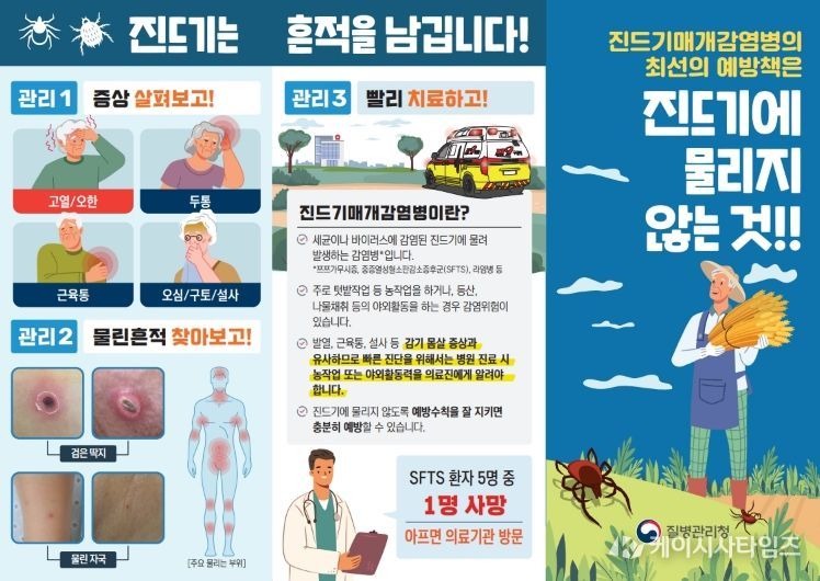 (케이시사타임즈) 질병관리청은 진드기 매개 감염병인 중증열성혈소판감소증(SFTS) 환자가 4월 23일(목) 울산광역시에서 올해 처음 발생했다고 밝혔다. 첫 환자는 농작업을 하던 70대 남성으로, 현재 입원 치료 중이다. 특히, 경상북도는 2025년 SFTS 환자 수 45명으로 전국 1위를 기록하여 김천시 주민들의 각별한 주의가 요구된다.