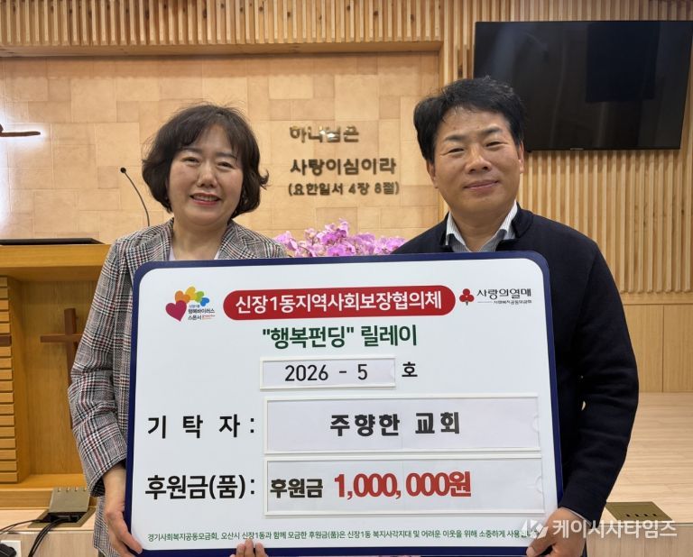 (케이시사타임즈) 오산시 신장1동 행정복지센터는 지난 24일 신장1동 소재 주향한교회가 어버이날을 맞아 관내 취약계층 어르신들을 위한 후원금 100만원을 기탁했다고 밝혔다.