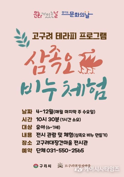 (케이시사타임즈) 구리시는 4월부터 고구려대장간마을에서 매월 마지막 주 수요일 ‘문화가 있는 날’을 맞아 ‘삼족오 비누 체험! 고구려 치료 프로그램’을 운영한다고 밝혔다.