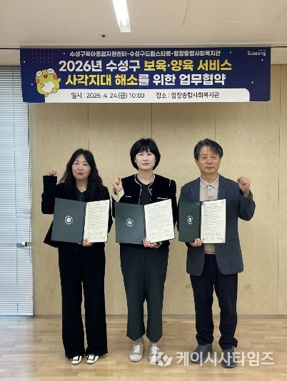 (케이시사타임즈) 대구 수성구육아종합지원센터(센터장 심영숙)는 지난 24일 수성구 드림스타트센터(센터장 김은미), 함장종합사회복지관(관장 권혁철)과 지역 내 보육·양육 서비스 사각지대 해소를 위한 ‘3자 업무협약(MOU)’을 체결했다고 밝혔다.