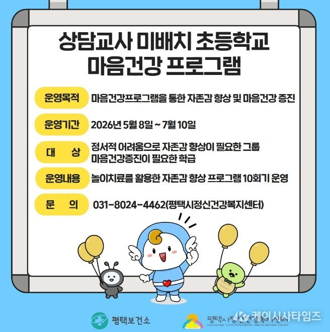 (케이시사타임즈) 평택시는 상담교사가 배치되지 않은 초등학교 학생들의 정신건강 지원을 위해 ‘마음건강 프로그램’을 운영한다고 밝혔다.
