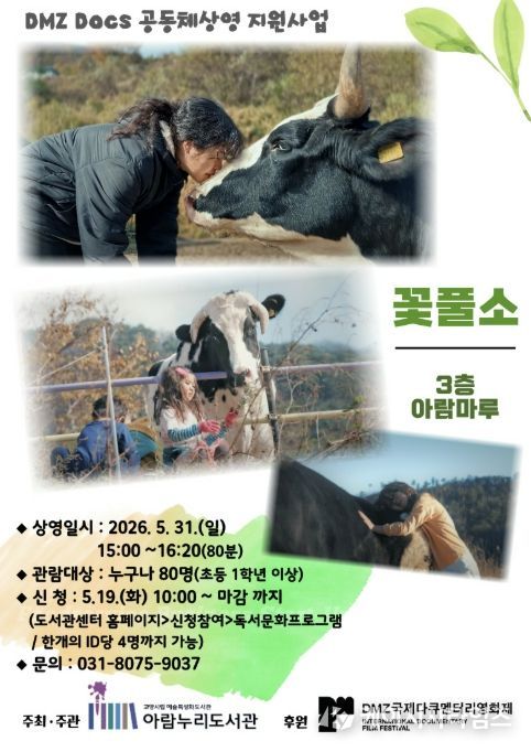 (케이시사타임즈) 고양특례시 아람누리도서관은 DMZ국제다큐멘터리영화제와 협업해 오는 5월 31일 오후 3시, 도서관 3층 아람마루에서 다큐멘터리 영화 ‘꽃풀소’ 상영회를 개최한다.