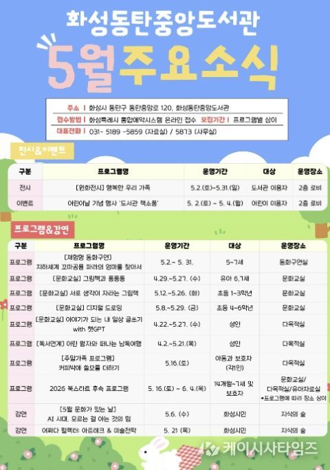 (케이시사타임즈) 화성동탄중앙도서관이 어린이날과 가정의 달을 맞아 5월 한 달간 도서관 이용자와 시민을 대상으로 자료실과 3층 공공의 마당 등에서 다양한 문화행사를 운영한다.